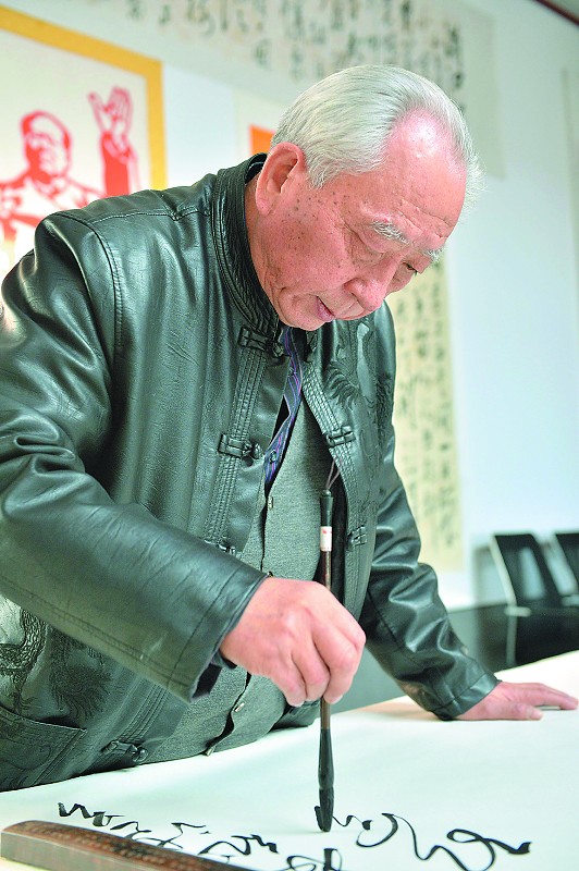 今年71岁的赵耀华老先生,1942年生于沧州南皮,1967年毕业于河北大学教育系。他的学书历程得从他大学说起。1963年,毛泽东发表了“向雷锋同志学习”的题词,这幅草书字的笔法、章法之美,让当时20岁出头的赵耀华着了迷。“从此,我便开始了对毛泽东草书的学习和临摹。”赵耀华说。